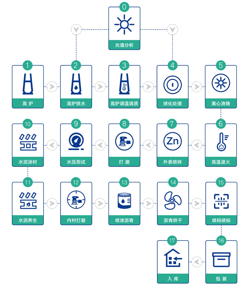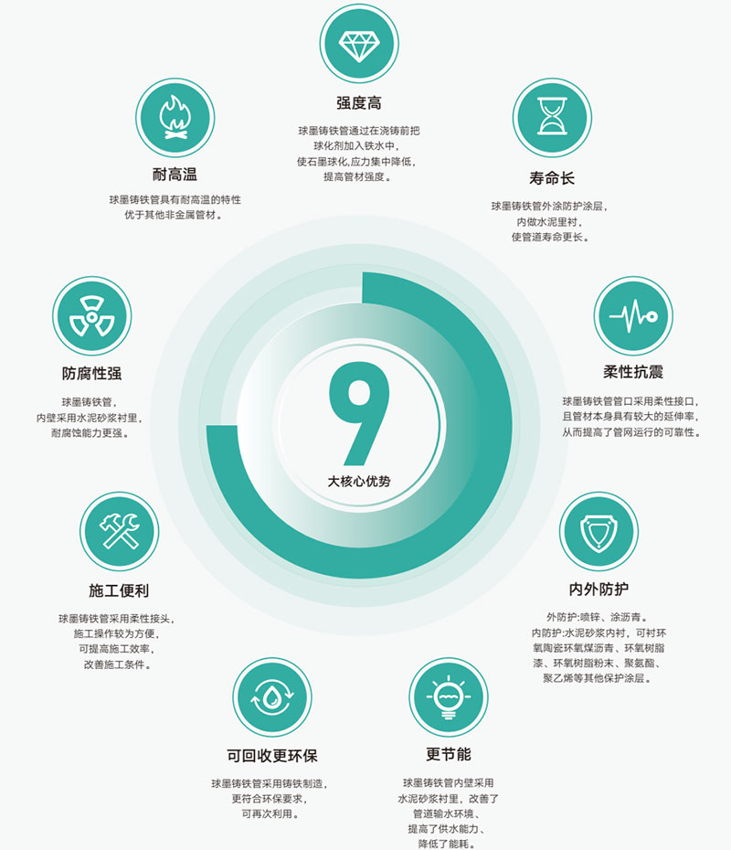 球墨鑄鐵管是指鐵水經(jīng)添加球化劑后,經(jīng)過離心球墨鑄鐵機高速離心鑄造成的管材。球墨鑄鐵管中石墨是以球狀形態(tài)存在的,克服了片狀石墨對鐵基體連續(xù)性的阻止作用,使鐵具有了卓越的可延性、柔韌性和抗沖擊性,因而材料本身的機械性能得到了較好改善,具有鐵的本質(zhì)、鋼的性能。